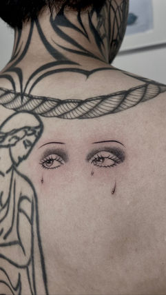 After studying applied arts and architecture , Tomie became a graphic designer. With a desire to become a tattoo artist, she began her self-taught journey in 2018 before joining the Rayon Noir studio in 2023 to refine her skills under Maxlesquatt . Drawing on diverse sources of inspiration, Tomie bases her work on traditional American tattoo designs, incorporating her artistic preferences: finer lines, more nuanced shading , and melancholic motifs inspired by the Y2K aesthetic.